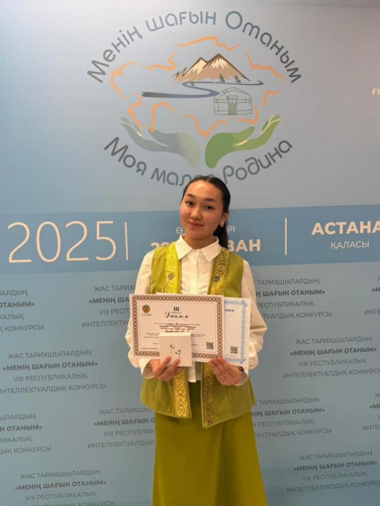10-сынып оқушысы Жуманова Аружан Қуатқызы "Менің шағын Отаным" Республикалық интеллектуалдық байқауда ІІІ орын иеленді